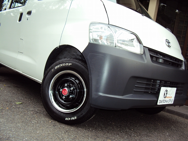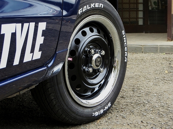 | 仕事用の車に装着しました。 黒いスチールホイールとクロームメッキのリングは足元が引き締まり 見た目もグレードアップです。 |