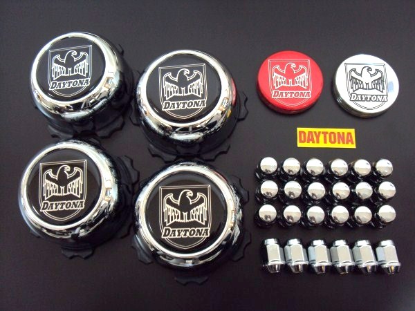 【セット内容】 デイトナクロームキャップx4個、オーナメント黒・赤・銀、各4枚、スチールメッキナット21 HEXタイプx24個 (頭の形状が写真と異なる場合があります。) 、DAYTONA ミニステッカーx4枚
